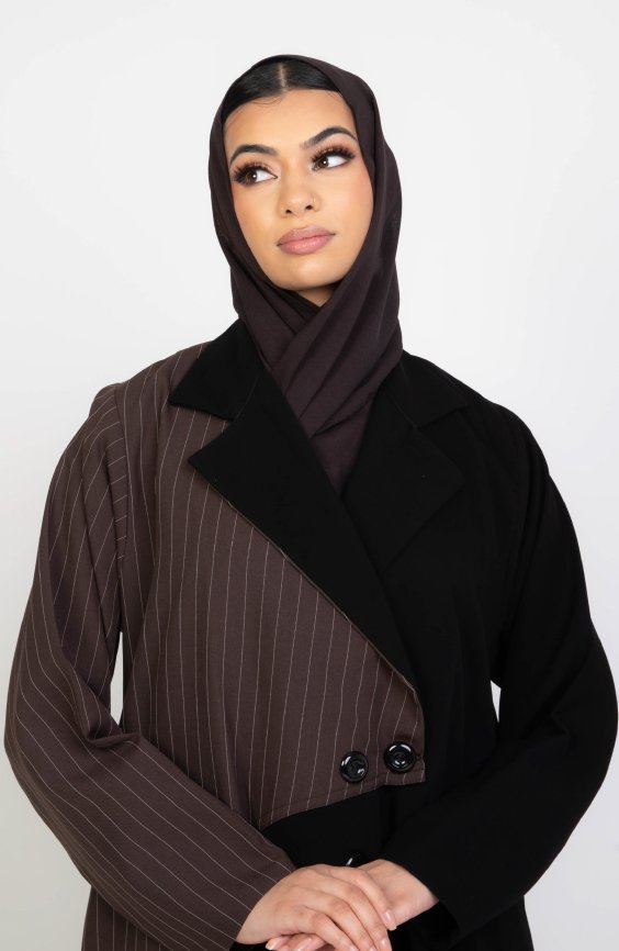 This elegant abaya is a versatile addition to any wardrobe. Designed with a refined silhouette, a sophisticated pinstripe pattern, and a button-down front, it offers a contemporary modern modest attire.