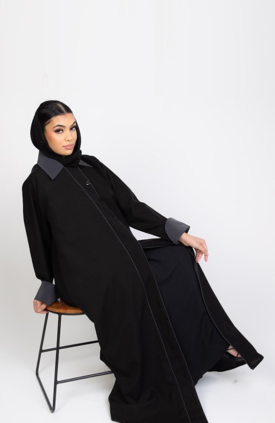 This abaya is the ultimate choice for women who desire to blend modesty, elegance, and functionality with ease. Designed with a structured blazer-inspired silhouette, it features sharp grey detailing on the collar and cuffs, adding a refined contrast to the rich black fabric.